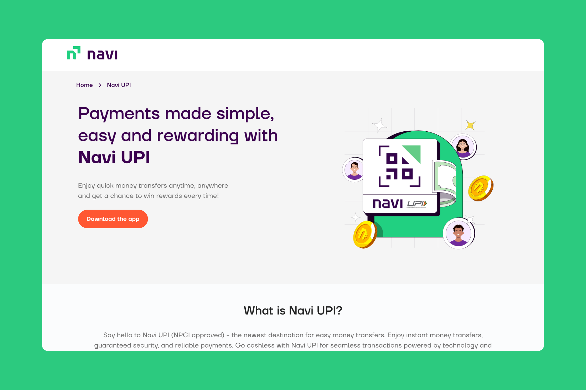 Its official UPI page says users get a chance to win rewards every time they use Navi UPI, and its RuPay credit card on UPI section says users can get rewards and cashback for UPI transactions.